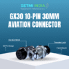 GX30 10-pin 30mm circular aviation connector with threaded screw coupling for secure connections. Supports 250V-600V AC/DC, 20A-30A, featuring nickel-plated brass housing and copper alloy pins for high conductivity. IP65/IP67 waterproof rating, soldered wire terminals, and panel mount design make it ideal for crane systems, industrial power, and automation applications